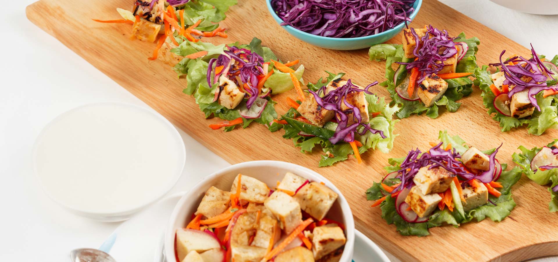 8. Garnish salad leaves with vegetable and tofu mixture.